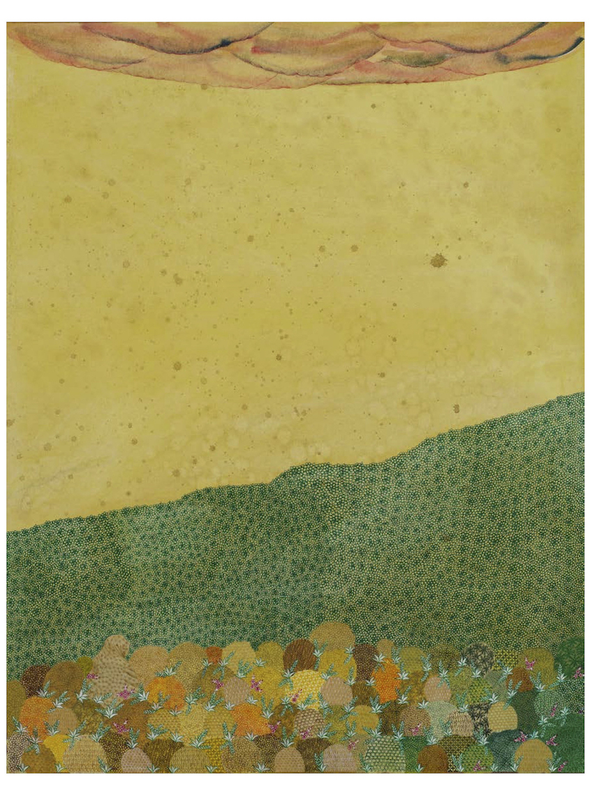 Ham Sāya Kouh Hā draws from the geographical and mental progression across a paradoxical landscape—half refuge, half dead end. From arid slopes to fertile furrows, from scarred neighborhoods to blooming hills, the exhibition sketches a panorama of identity and artistic ridgelines. All the way from the immersion suggested by Feroza Hakeem within a nature that encapsulates loss and memory, to the ultimate gathering under the combative banner of Kubra Khademi, and through the patient memorial gestures of Latifa Zafar Attaii, and the modest search for origins within the layers of oral and familial history initiated by Parwana Haydar, artists collectively lean towards this horizon like a mirage, so close and yet so far, known in Persian as the “mountain behind the mountains.”[1]