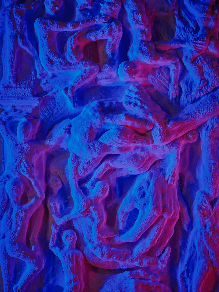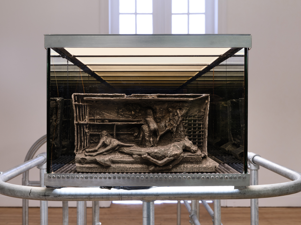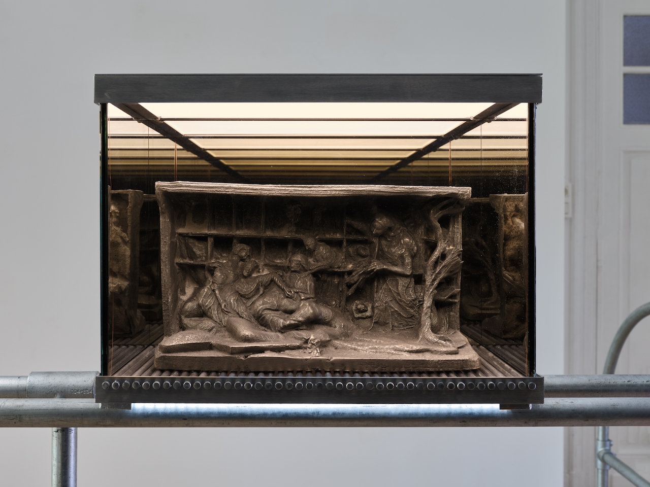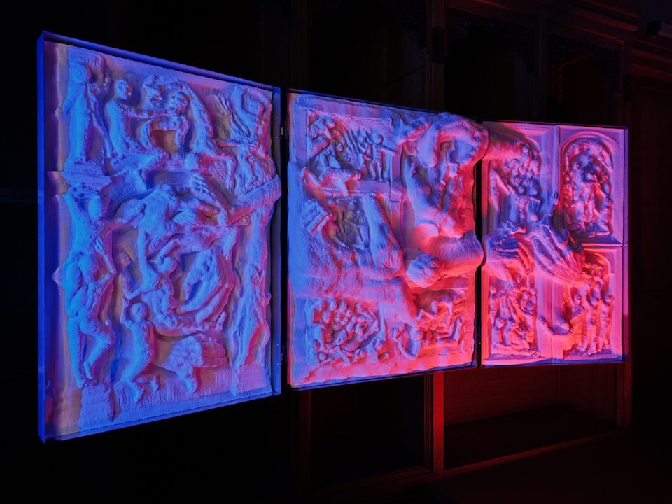 Avec Ne pas réveiller les chiens qui dorment, L’Hoest conçoit un retable contemporain où se rejouent les tensions entre sacré et technologie, mémoire et matière. Entièrement sculpté dans l’espace virtuel, puis imprimé en 3D, le triptyque transpose le modelage manuel dans une « glaise digitale ». Grâce à des lignes de code, le retable révèle dans sa matérialité la trace de son propre processus : les filaments déposés par la tête d’impression tissent un réseau fragile entre les formes, comme un maillage organique reliant des “îles” de matière – terme employé en impression 3D pour désigner les zones isolées du volume. Les strates visibles dessinent une topographie du geste mécanique, comme une cartographie du mouvement de la machine. Les figures – mains démiurgiques, corps fragmentés, chiens endormis – convoquent les iconographies du jugement, de la révélation et de la protection. Les chiens, comme des chimères, veillent sur un monde suspendu, gardien·ne·s d’un sacré déplacé dans la sphère technologique. L’œuvre esquisse un purgatoire contemporain, un espace où pensée et matière se confondent, où langage et foi se reforment à l’échelle du code.
