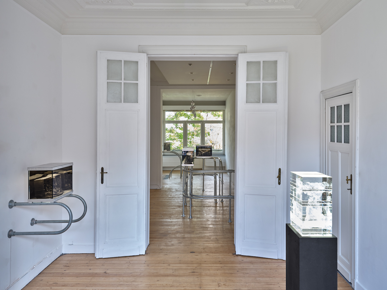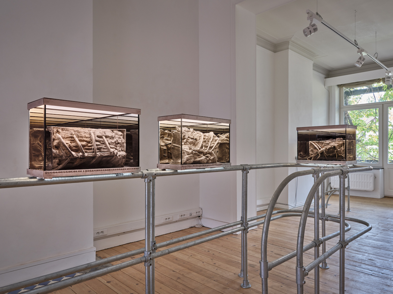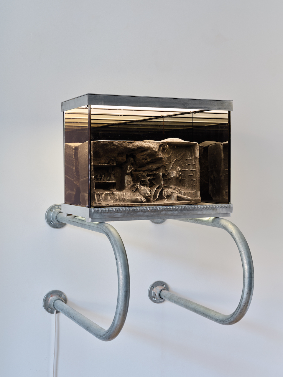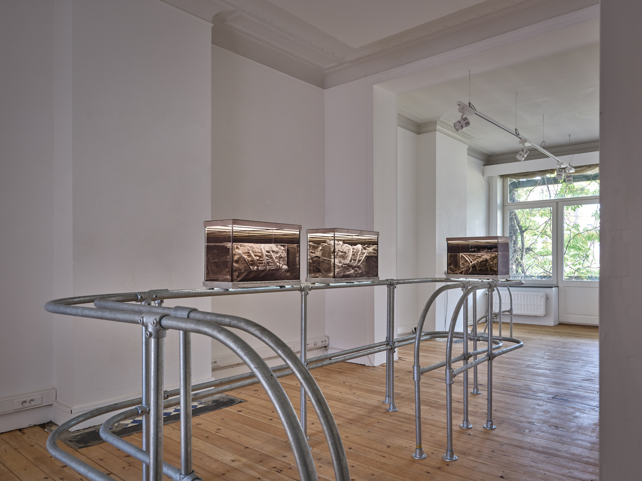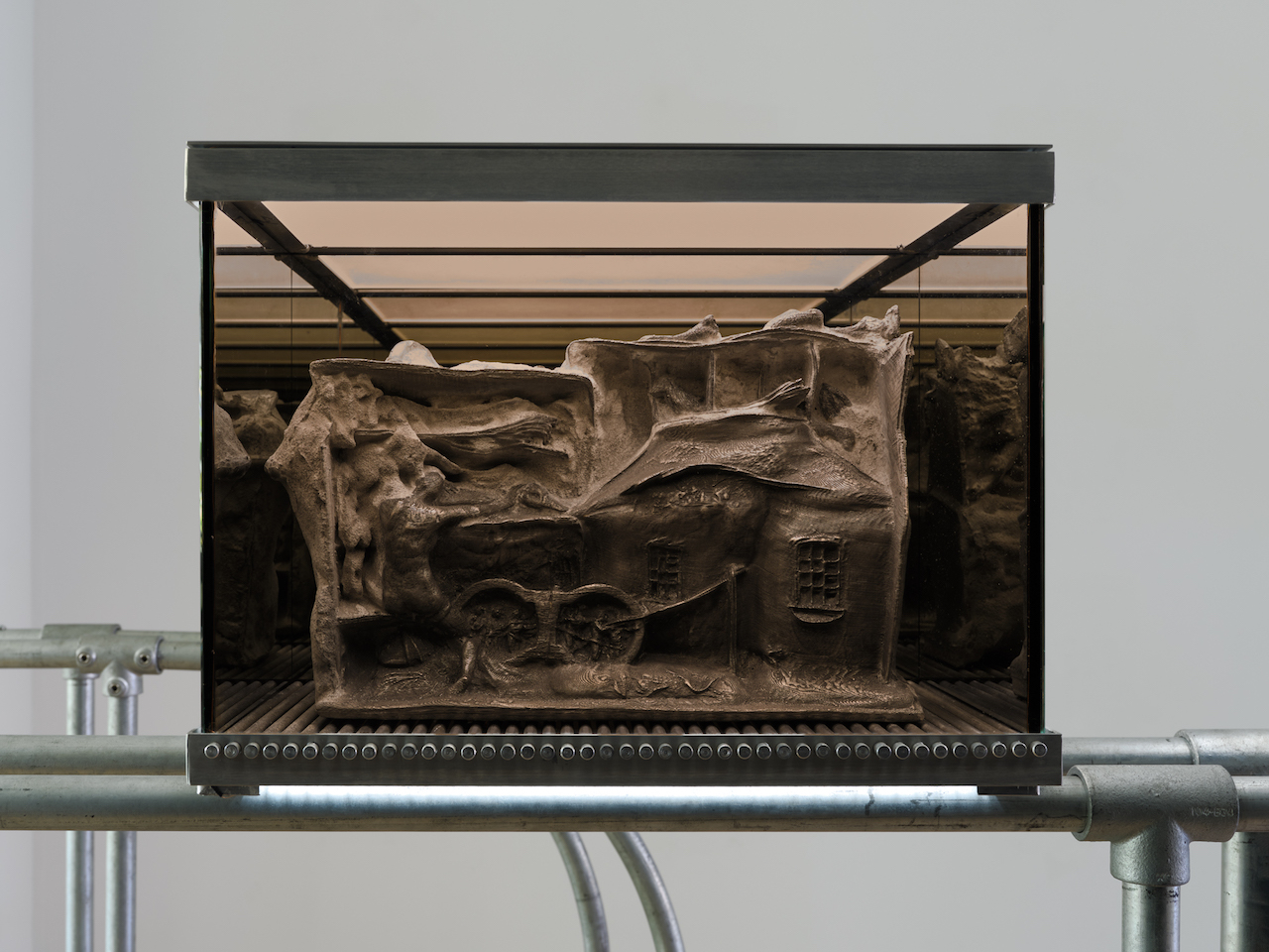 Les sculptures d’Inkstand – Fragments of Intents, réalisées en alliage de bismuth et d’étain, se délient de leurs moules de sable comme d’une gangue originelle. Suspendues entre apparition et effondrement, elles forment de petits mondes clos, dioramas domestiques habités par des figures humaines et animales, éclairées de l’intérieur, entre veille et rêve. Présentées dans des vitrines évoquant les operant conditioning chambers mises au point par B.F. Skinner dans les années 1930, elles déploient une réflexion sur le conditionnement des comportements, du laboratoire aux interfaces numériques, où nos gestes et nos attentions se trouvent façonnés par des architectures invisibles. Les vitrines reposent sur un ensemble de rampes métalliques qui sillonnent l’espace et guident le regard et le corps du visiteur, à l’image des algorithmes qui orientent nos trajectoires dans l’espace numérique selon une logique de contrainte implicite.