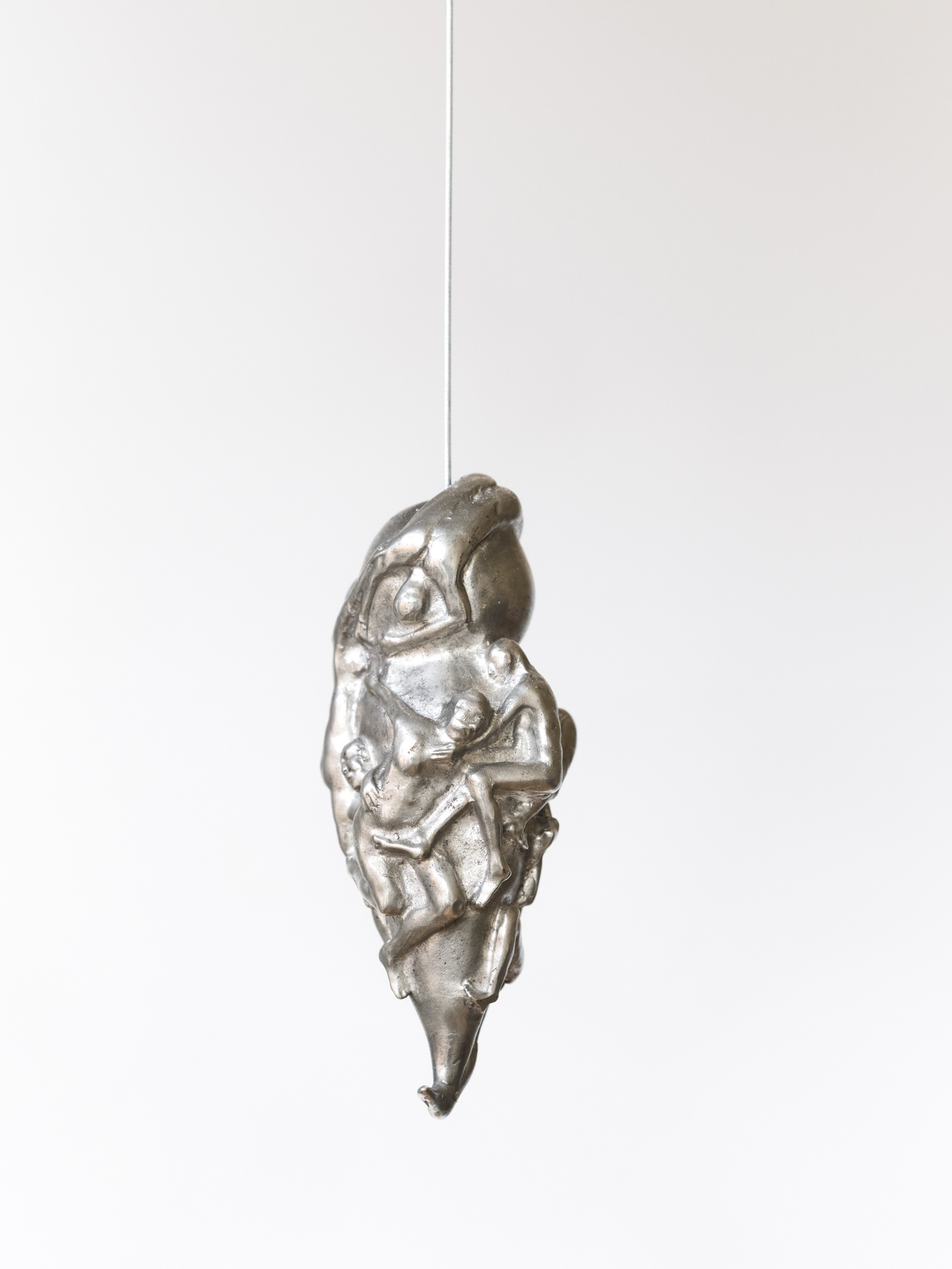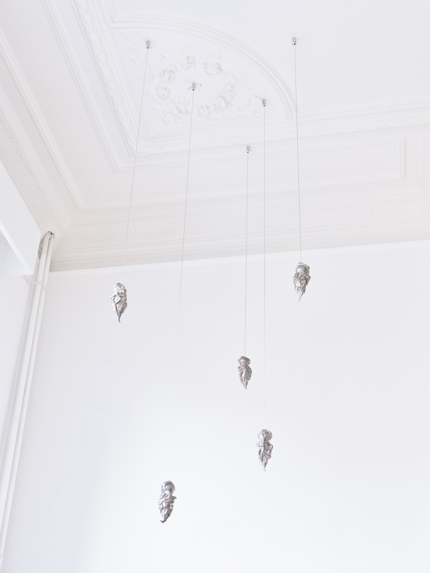 Disséminée dans l’espace, la série de pendentifs Spectio (False North) poursuit la réflexion d’Eva L’Hoest sur l’expertise technique — de la groma romaine aux algorithmes contemporains — et sur son pouvoir de légitimation. Dans l’Antiquité, seuls les augures, souvent issus du corps des magistrats, pouvaient lire les signes du ciel et orienter le destin collectif ; aujourd’hui, les technologies prédictives prolongent ce geste en façonnant de nouvelles formes de pouvoir sous le couvert du savoir scientifique. Suspendues dans l’air, les sculptures rappellent ces instruments de mesure utilisés pour délimiter les fondations des villes, associés à la spectio — l’observation rituelle du ciel — où le regard devient instrument d’ordre. Spectio agit comme une méditation sur la fragilité de nos repères, sur la manière dont foi, connaissance et désir de mesure s’inversent dans un monde saturé de champs d’attraction.