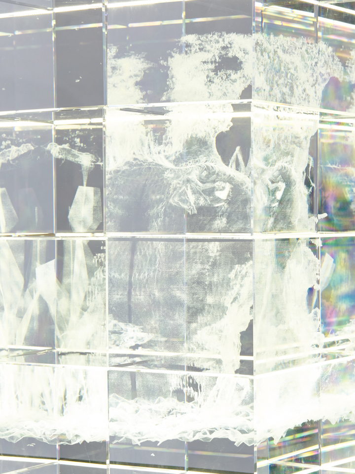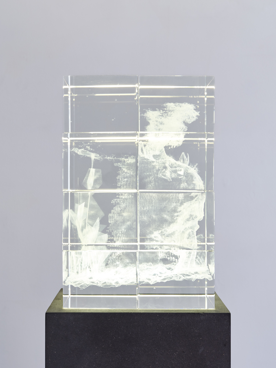 Gravées dans des blocs de cristal, des figures issues du film The Inmost Cell apparaissent comme des fragments suspendus – des architectures liquides flottant dans un espace sans gravité. La figure centrale provient du scan 3D d’un fragment de la falaise de Staburadze, légende lettone d’une jeune fille changée en pierre par ses larmes, aujourd’hui partiellement engloutie sous les eaux du barrage de Riga. Au cœur de la matérialité invisible de nos écrans et de nos mémoires numériques, le cristal devient le réceptacle de flux figés : larmes, courants, données. L’œuvre conserve la trace d’un espace intermédiaire, là où mémoire humaine, mythe et matière numérique se confondent.