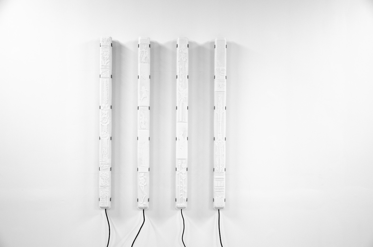 latent_breath_() — œuvre éponyme de l’exposition — prolonge cette recherche. Les images, générées par intelligence artificielle pour un bref instant, sont saisies par l’artiste avant de disparaître, figées dans la matière de la lithophanie puis révélées par un dispositif lumineux semblable à un négatoscope. Ces images fugitives, rendues visibles par l’intuition et le geste de l’artiste, rappellent, selon les mots de Georges Didi-Huberman à propos des moulages de Rodin, que : « Ce n’est plus le substitut d’un référent absent, mais un mouvement substituant, un travail figural de la substitution qui ne cesse de s’engendrer lui-même. » [1]