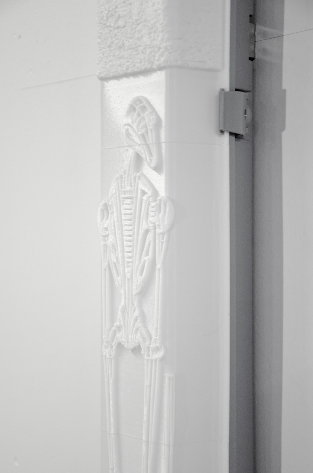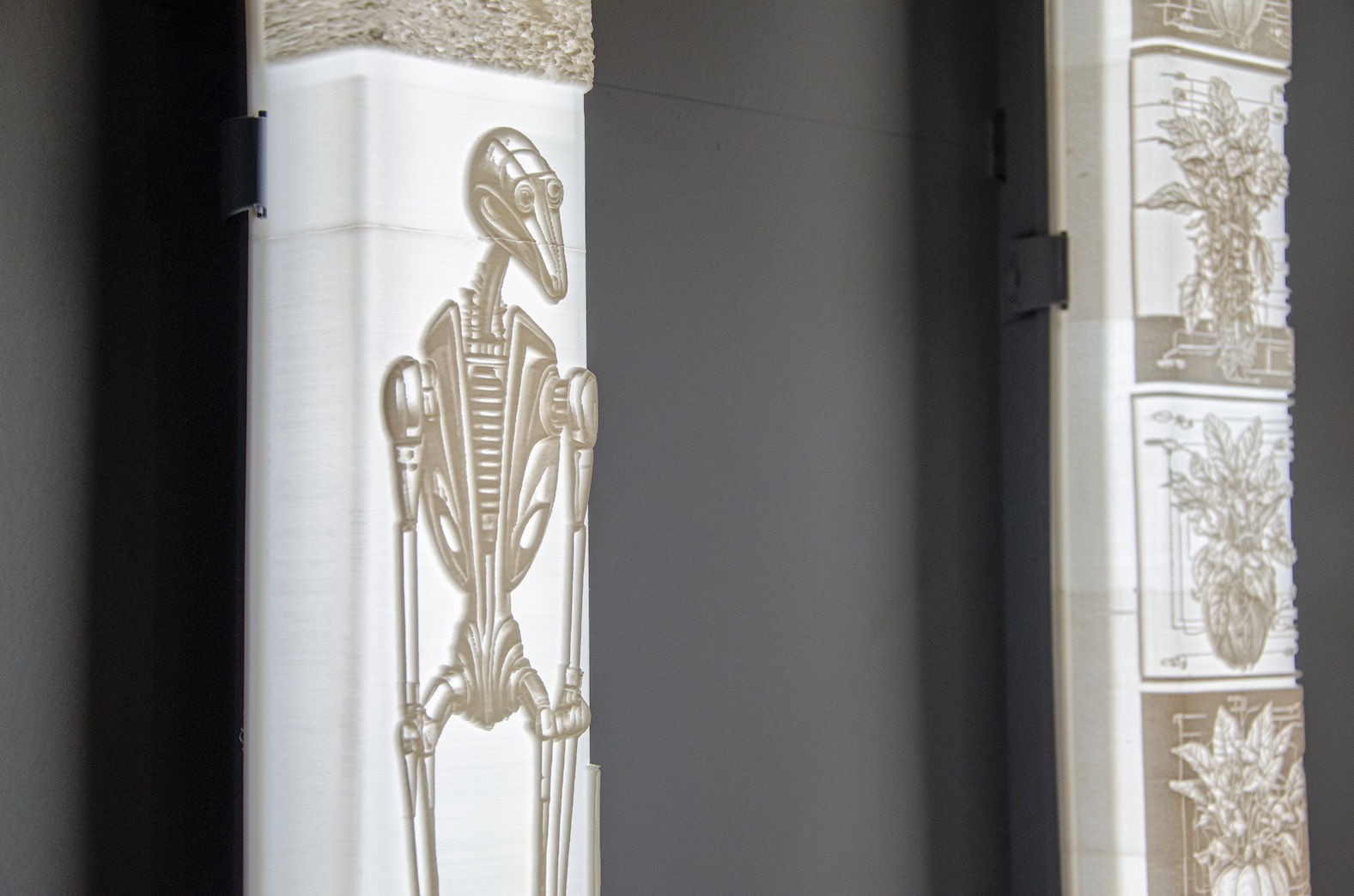Pour Griza:j Hypermat’, l’artiste s’inspire de la lithophanie, technique emblématique du XIXe siècle consistant à modeler des images dans une porcelaine translucide, visibles uniquement par rétroéclairage. Pierre Gaignard en propose une réinterprétation contemporaine grâce à l’impression 3D, transformant les caches de néons industriels en surfaces sculptées. Entre disparition et persistance, les images hybrides qu’il crée, issues de modèles botaniques anciens générés par IA, évoquent les décors grotesques — une thématique que j’ai également eu le plaisir d’explorer à ses côtés. Ces images, à la fois précaires et puissantes, deviennent des figures de connaissance, des images dialectiques au sens benjaminien : elles captent la tension entre passé et présent, entre mémoire et invention, où un détail soudain éclaire une nouvelle lecture du réel.